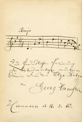 HÄNFLEIN GeorgPortée musicale autographe signée, dédicacée à Olga Ruben. Hannover 16 février 1883 ; 1 page in-12. On joint un poème à la même dame, Olga Ruben, signé « S. Coppel ». 1883.