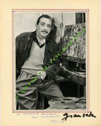 GRAU-SALA Émilio ou ÉmilePhotographie signée, dédicacée au peintre Constant Baruque. Photographie (retirage ?) en noir et blanc, le représentant dans son atelier. 1964 ; 140 x 190 mm, collée sur un support cartonné de 200 x 250 mm. « À Constant Baruque, bien cordialement. Paris 64. Grau-Sala ». Au dos, collée au carton, figure une biographie.