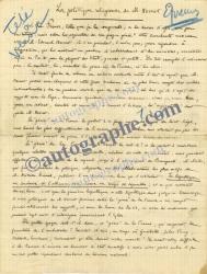 GOYAU GeorgesManuscrit autographe signé. 4 pages in-folio. Manuscrit sans doute publié au Figaro. La politique religieuse de M. Herriot. « La France, telle que je la comprends, a le devoir d’agir, non par imitation, mais selon les aspirations de son propre génie. Cette tranchante maxime est de M. Edouard Herriot : il s’en prévalait, l’autre jour, pour répondre à l’opposition, qui lui montrait un parterre d’ambassadeurs et de ministres. [...] L’Allemagne observerait, ricanerait... L’Allemagne s’amuserait fort en apercevant, dans une Alsace éplorée, devant une France atterrée, un mouvement semblable à celui qu’en 1906 provoquèrent les inventaires. Et l’Alsace, je le sais, aime trop la France de toujours pour ne point pardonner. »