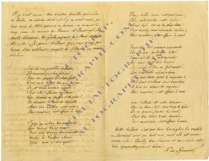 GRAMONT Ferdinand, comte deLettre autographe signée. 6 octobre 1873 ; 3 pages in-8°. Il énumère à son correspondant les maisons souveraines et non souveraines de l’Italie, au XVIe siècle. Puis il compose dans le corps de la lettre une ballade :« J’ai lu vos gentilles balladesEt souvent je les reliraiPour me purger des choses fadesDont en ce temps, bon gré, mal gré,On est sans mesure écœuré.Sous cette influence malsaineQue d’ennuis on souffre et de gêne !On succombe à tant de dégoûts,Mais rien n’altère votre verve,Cher Monsieur, c’est affaire à vous.[…]La ballade est votre domaine.Une ou deux, soit ; sans trop de peineOn en pourra joindre les bouts ;Mais d’en tisser triple domaine,Cher Monsieur, c’est affaire à vous.Cette ballade n’est pas dans les règles ; les couplets ne devraient avoir que huit vers, mais elle est venue comme cela. »
