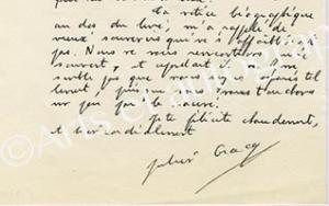 GRACQ Julien (Louis Poirier, dit)Lettre autographe signée, adressée à M. Morvan Lebesque, journaliste et condisciple de Julien Gracq au lycée Clemenceau de Nantes. Le 30 octobre ; 1 page in-8°. « Ton livre m’attendait à St Florent et je t’en remercie bien tard. […]. Comme tu le penses je connaissais déjà beaucoup de ces textes qui font de toi un des journalistes les plus fidèlement suivis, et même écoutés, ce qui est plus rare. Je te signale que tu as ici à Saint-Florent, parmi tes “fans” un journalier agricole — un de mes camarades d’école — qui te lit avec passion et m’a parlé de toi l’an dernier avec quelque chose qui ressemblait à du fanatisme. »