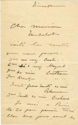 GRANADOS EnriqueLettre autographe signée, adressée à M. Dandelot. Dimanche ; 2 pages in-12.« Voilà la sonate que nous jouons :3me mi mag. Bach6me si mag. Mozart7me do min. Beethoven9me Kreutzer. Beethoven.Zweite Grosse Sonate re min. Schumann3me Sonate re min. BrahmsJe serai à Paris le 30 pour travailler deux jours avant les concerts. […] Mon Prenom Henri ou Enrique en Español. »