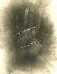 GIRAUDOUX JeanEmpreinte de la main droite de Jean Giraudoux, sur une feuille de papier noircie à la fumée et ayant servi à la réalisation du livre La Main de l’écrivain, publié chez Stock.