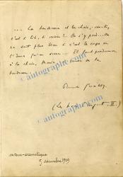 GÉRALDY Paul (Paul Lefèvre, dit)Pièce autographe signée. 5 décembre 1919 ; 1 page in-8°. Extrait des « Noces d’Argent, II ». « La tendresse et la chair, vois-tu, c’est si lié, si voisin !... On s’y perd ... on ne saiT plus bien si c’est le corps ou l’âme qu’on serre... Il faut pardonner à la chair, Marie, à cause de la tendresse. Paul Géraldy ».