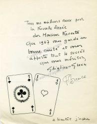GHIGLION-GREEN MauriceLettre autographe signée avec dessin, adressée Raymond Nacenta, directeur de la galerie Charpentier. [1967] ; 1 page in-4°. « Tous nos meilleurs voeux pour la Nouvelle Année cher Monsieur Nacenta. Que 1967 vous garde en bonne santé et vous apporte tout le succès que vous méritez ».La lettre est illustrée d’un dessin à l’encre représentant deux cartes l’as de trèfle et l’as de coeur.