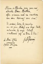 GHEUSI Pierre-BarthélemyPièce autographe signée, adressée à André Vally, la cantatrice qui chanta dans Béatrice, œuvre d’André Messager, produite à Monte-Carlo le 21 mars 1914. Opéra Comique, 4 mai 1914 ; 1 page in-12.« Bleue et blanche, priez pour moi, adorable soeur Béatrice, qu’aucun mal ne meurtrisse mon coeur désormais sans émoi !Et surtout, baissez la paupièresur vos yeux, archers aux longs traits ;autrement, les anges distraitsm’oublieront près de Dieu le Père !P.B. Gheusi.»