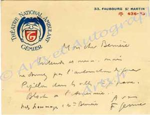 GÉMIER (Firmin Tonnerre, dit)Carte autographe signée, adressée à M. Berrière. 1 page in-16 oblongue. En-tête illustré du Théâtre national ambulant Gémier. « Ne donnez pas l’autorisation de jouer Papillon dans les villes où je passe. »