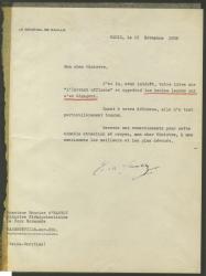GAULLE Charles deLettre dactilographiée signée, adressée à Mr Maurice D’Hartoy. Paris, 25 novembre 1958; 1 page in-folio. Bordure gauche contre collée sur carton leger . En-tête “ Le GÉNÉRAL De GAULLE ”. « Mon cher Ministre, J’ai lu, avec intérêt, votre livre sur “ L’instant efficace ” et apprécié les hautes leçons qui s’en dégagent. ( ses derniers mots sont soulignés en rouge ) Quant à votre dédicace, elle m’a tout particulièrement touché. Recevez mes sentiments pour cette aimable attention et croyez, mon cher Ministre, à mes sentiments les meilleurs et les plus dévoués ».