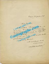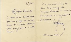GANNE LouisLettre autographe signée, adressée à M. Everaerts. « 29 juin » ; 2 pages in-12. « J’apprends le terrible coup qui vous frappe et m’empresse de vous dire toute la part que je prends à votre deuil ! »
