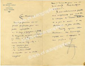 GANNE Louis GustaveLettre autographe signée. Sans date ; 2 pages in-8°. En-tête du « Casino de Monte Carlo — Concert Ganne ». « Chère Madame. Voici le programme qui me paraît préférable pour mon public cosmopolite : Le Songe d’Iphigénie de Glück, Marguerite au rouet de Schubert, Prière de La Tosca de Puccini.