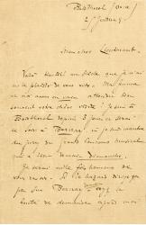 GANNE Louis GustaveLettre autographe signée, adressée à un lieutenant. Bois Botrel , 25 juillet 1890 ; 2 pages 1/4 in-12. « Voilà bientôt ! un siècle que je n’ai eu le plaisir de vous voir. Ma femme et moi avons en vain attendu bien souvent votre chère visite ! Je suis à Bois Botrel depuis trois jours et serai ce soir à Bernay, où je suis membre du jury du grand concours musical qui a lieu dimanche. »