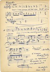 GANNE LouisPièce musicale autographe signée, adressée à André Vally, la cantatrice qui chanta dans Béatrice, œuvre d’André Messager produite à Monte Carlo le 21 mars 1914. Mars 1914 ; 1 page petit in-8°. Extrait de son opérette « Cocorico » : « À Madame Andrée Vally avec ma respectueuse sympathie et ma vive admiration. Louis Ganne. Monte Carlo Mars 1914 ».