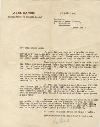 GANCE AbelLettre signée « Abel », adressée à M. et Mme Jean Tedesco. Paris, 25 août 1949 ; 1 page in-4° sur papier à son en-tête gravé. « Je suis furieux contre la tempête de Vaucottes qui vous a arraché vos arbres. [ ] Nous rentrerons à Paris (après une cure à Aix les Bains que nous partons faire aujourd'hui) vers le 15 septembre. [ ] Vous êtes gentille ma petite Aimée, de me parler de Lucrèce Borgia, mais j'ai à ce point oublié ce film et cet assassinat du deuxième mari de Lucrèce, que je serai capable de dire en voyant le film : quel est le s... qui a fait ce travail là !. Je n'ai pas besoin de vous dire que j'ai été très touché que la saint Abel ne soit pas passée inaperçue dans vos curs. [ ] Je crois vous avoir dit que nous avons adopté une petite fille abandonnée par ses parents. Je l'ai baptisée Clarisse. C'est un véritable amour. » Lettre emplie d'une grande sensibilité.