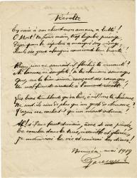 GARENNE AlbertManuscrit autographe signé de 2 sonnets. Nouméa, mai 1919 ; 2 pages in-4°. « 2 petits sonnets d'hier » : « Premières Alarmes » (« Le jardin, pas à pas, languissante et pâtie »), et « Révolte » (« En vain à son chevet mon amour a lutté ! »). [Ces sonnets ont été écrits à Nouméa, alors que Garenne avait été nommé en 1918 commandant supérieur des troupes du Pacifique et du bataillon de Nouvelle-Calédonie pour lutter contre l'insurrection canaque.]