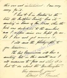 FRENCH Daniel ChesterLettre autographe signée, adressée à la romancière britannique Mary Kimball Ward. 3 février (ou juin) 1912 ; 2 pages in-8°, sur papier gravé à son adresse à Chesterwood- Glendale, Massachusetts, en anglais.« It seems [...] there is always some important thing over looked and when i had your regret that your name was not linked with her word’s in the book. I felt as if we had indeed committed a gracious sin of omision. I have not yet see the book over i did not appreciate that we had failed to give you the place in ot which should be yours. Of course you know that this was not international. I am very sorry for it. I had to be in Boston at the time the Sculpture Society had it’s meeting in honor of Mrs Ward when the book was distributed to the members, and i suppose mine was left for us. I have not yet received it. I will send the photographe to you tomorrow. The best commission will have a meeting late in this month and i will [...] to find out what it is best to do about the Whashigton. Very sincerely yours. Daniel C. French. »