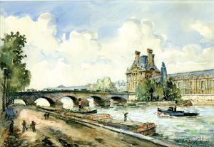 FRANK-WILL (Frank Boggs, dit)Le Louvre et le pont du Carrousel. Aquarelle et fusain sur papier signé en bas à droite « Franck Will ». 23,4 x 32,2 cm.