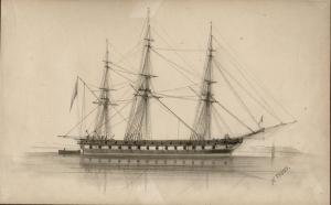 FREMY Antoine Alexandre AugusteDessin à la mine de plomb, signé en bas à droite. [XIXe siècle] ; 19 X 30 cm. Dessin représentant un vaisseau de guerre au mouillage.
