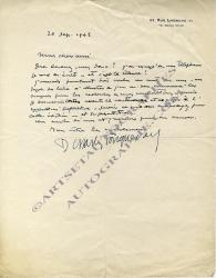 FOUQUERAY CharlesLettre autographe signée, adressée à un éditeur. Paris, 20 septembre 1942 ; 1/2 page in-4°. « Que devenez-vous donc ? Et c’est le silence ! J’aurais pourtant bien voulu un mot de vous, un sujet du livre à illustrer. J’en ai commencé les croquis pour les recherches de mes compositions. […] j’aimerai […] savoir ce que vous entrevoyez pour cette édition, et sa présentation. »