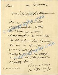FONVIELLE Wilfrid deLettre autographe signée, adresse à M. Ballot. Paris, 22 novembre ; 1 page in-16. « Voici un petit supplément de notes qui vous permettra d’augmenter le nombre des clichés entre lesquels vous avez à choisir. »