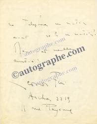 FEYDEAU GeorgesLettre autographe signée à un ami. Paris, 3 août 1916 ; 1 page in-8° sur papier à en-tête du Grand Hotel Terminus. « Voici deux lettres que j’ai reçues d’Espagne pour le “Fil à la patte”. Veux tu voir dans mes traités si je suis libres dans ce pays là et répondre à ces propositions en conséquence. »