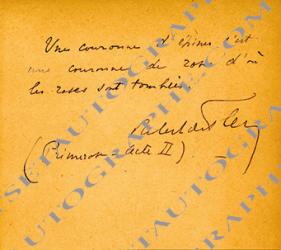 FLERS Robert Pellevé de La Motte-Ango, marquis dePensée autographe signée. 1/2 page in-8°. Extrait de Primerose (acte II) : « Une couronne d’épines c’est une couronne de roses d’où les roses sont tombées. Robert de Flers »