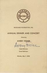 FISCHER AveryPièce signée. Menu du dîner et du concert annuel de la Musicans Foundation à Baltimore le 7 mai 1979.
