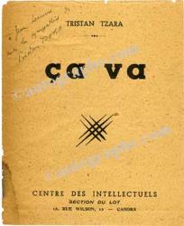 TZARA Tristan« Ça va ». Centre des Intellectuels, Cahors, [1943] ; in-16 (110 X 135 mm), 12 pages, agrafé tache au niveau de l’agrafe). Édition originale sur papier courant imprimée à petit nombre, il n’a été tiré que 15 pur fil en grands papiers. Envoi autographe à Jean Lescure. « À Jean Lescure avec la sympathie de Tristan Tzara ». Rare exemplaire dédicacé.