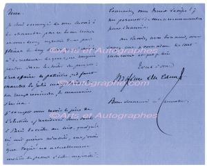 DU CAMP MaximeEnsemble de 2 lettres autographes signées. Baden-Baden, 1877 et 1881 ; chacune sur feuillet in-8°, l’une avec trace d’adhésif.25 novembre 1877 : « Je serai du jury pour le 1e Xbre ; ce qui me force à rentrer plus tôt que je n’aurais voulu ». 13 août 1881 : « J’ai oublié de vous prévenir que je dirais à âme qui vive que je devais à votre complaisance de savoir le nom de Mme Le Pic. »