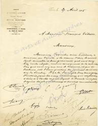 COMÉDIENS.Lettre signée, adressée à François Tédesco. Paris, 27 avril 1905 ; 1 page in-4°. En-tête imprimé « Comité de l’association de Secours mutuels entre les artistes dramatiques ». « Monsieur Coquelin aîné, Président, a annoncé au comité à la séance d’hier, la mesure tant aimable et bien gracieuse que vous avez bien voulu adopter, comme conséquence de la conversation que vous avez eue avec M. Brémont et qui se traduira par l’envoi gratuit du journal dont vous avez la direction. Il y a là, l’exemple d’un témoignage d’intérêt pour les vieux comédiens qui est précieux à tous et à toutes et pour lequel le Comité vous prie d’agréer ses plus chaleureux et sincères remerciements. » Ont signé notamment : Coquelin, Grivot, C. Lamy, Brémont, Debruyère, Alexandre, Louis Ulbach, L. Péricaud, Galipaux, Guyou, Regnard, etc.