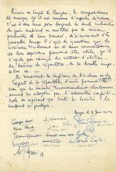 COMPOSITEURSPièce signée par de nombreux musiciens dont : Arthur Honegger, Georges Auric, Arthur Bliss, Werner Egk, Marcel Poot, Jean Binet, Franco Alfano, Géza Frid, Ernest Van der Eyken, Maurice Schoemaker, etc. Bergen, 5 juin 1954 ; 1 page in-folio. « Réunis au congrès de Bergen, les compositeurs de musique qu’il est convenu d’appeler sérieuse, c’est-à-dire ceux pour lesquels la seule recherche du gain matériel ne constitue pas la raison première de leur travail, désireraient être consultés lorsqu’il s’agit de questions qui les intéressent directement et où leurs connaissances et leur expérience peuvent être utiles, qu’il s’agisse par exemple des contrats d’édition, des barèmes de répartition, de la double imposition, etc. Ils remercient la conférence des directeurs et des experts de la répartition d’avoir formulé en avril 1953 le vœu qui les concerne et recommandent chaleureusement son adoption par l’assemblée confédérale en espérant que toutes les sociétés le mettront en pratique. » Précieux document.