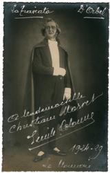 COLONNE ÉmilePhotographie autographe signée, dédicacée à Mlle Marvet. 1929 ; 14 x 9 cm. (Photographie de Jos. Rentmeesters à Bruxelles). « À Mademoiselle Christiane Marvet, Emile Colonne. 1924-29 ». Tirage d'époque. Emile Colonne, baryton à l'opéra Royal de la Monnaie figure ici dans le rôle de Georges d'Orbel, opéra La Traviatta de Verdi.