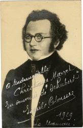 COLONNE ÉmilePhotographie autographe signée, dédicacée à Mlle Marvet. 1929 ; 14 x 9 cm. Photographie de Jos. Rentmeesters à Bruxelles. « À Mademoiselle Christiane Marvet, en souvenir de Schubert. Emile Colonne. 1929 ». Tirage d'époque. Emile Colonne, baryton à l'opéra Royal de la Monnaie figure ici pour une représentation de la Chanson d'amour à la Monnaie.
