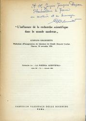 COLONNETTI GustavoPlaquette dédicacée à M. Jacques Jouques Duparc. « L'influence de la recherche scientifique dans le monde moderne ». 1955 ; 7 pages in-4°. Extrait de la revue La Ricerca scientifica.