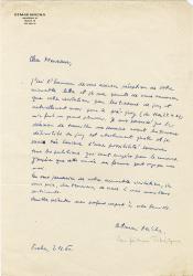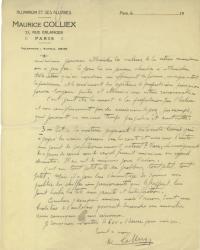 COLLAER PaulEnsemble de 2 lettres autographes signées. Malines, 1926 ; 1 page in-4°, chaque.— Malines, 21 octobre 1926 sur papier à en-tête « Concerts “Pro Arte” ».« Je compte jouer votre suite pour piano d’après les choeurs dont m’a parlé Milhaud, le 13 décembre. Vous me feriez un très grand plaisir en pressant votre éditeur pour qu’il m’envoie une épreuve à bref délai, car je prends toujours beaucoup de temps pour l’étude d’une oeuvre, de façon à pouvoir la présenter dignement ».— Malines, 14 décembre 1926 sur papier à en-tête « Association internationale de Musique Contemporaine ».« Vos choeurs ont bien porté. Le public a été, je crois, unanime pour en reconnaître les grandes qualités, et leur a fait un accueil très chaleureux. Je ne puis vous en dire davantage en ce moment, car je suis très fatigué. Figurez-vous que samedi je me suis payé le luxe d’une bonne petite grippe. J’ai réussi à me tenir droit à coup d’aspirines. Maintenant que l’effort a été fourni, j’ai besoin de repos. Je vous renvoie le matériel d’exécution aujourd’hui même. Vous trouverez dans la partition un programme du concert. ».