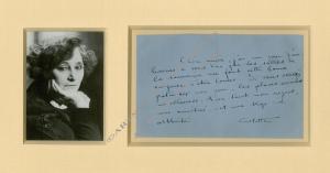 COLETTELettre autographe signée. 1 page in-8° oblongue, sur son papier bleu. « J’ai un peu d’embarras à vous dire que les salles de la semaine me font cette bonne surprise d’être louées... Si vous vouliez patienter un peu, les places seraient meilleures. » Pièce encadrée avec un cadre en loupe d’orme et un verre anti-ultraviolets.