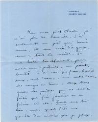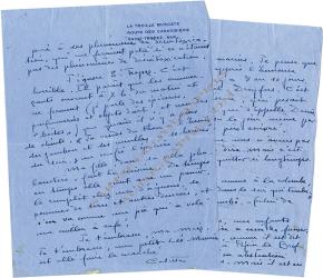 COLETTELettre autographe signée à son ami Chauveau. 2 pages in-4° sur papier bleu. Colette remercie son ami de lui avoir une carte qui annonce un mariage d’un de ses fils. « C’est une bonne nouvelle que m’apprte cette carte. Encore un jeune Chauveau de marié! Encore de jolis petits Chauveau en perspective ! Des petits Chauveau pour augmenter le groupe photographique que vous manquerez pas de m’envoyer ! Je souhaite que vous soyez tous heureux. Tenue par la patte, je ne puis aller vous voir. ( Pas sortie depuis sept semaines...) mais je n’oublie pas que vous m’avez promis des visites plus rapprochées. N’oubliez pas, ne négligez pas trop longtemps votre vieille amie qui vous embrasse. »