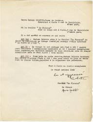 COLETTE (Sidonie Gabrielle Colette, dite)Pièce signée. Paris, le 20 octobre 1949 ; 1 pages in-4°. Contrat signé entre Colette et la société Le Fleuron, représentée par Maurice Goudeket. « Madame Colette cède à la société Le Fleuron le droit de publier, en un tirage limité, un ouvrage d’elle intitulé La Fleur de l’âge ».