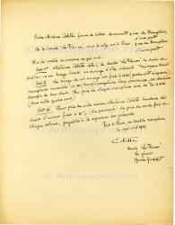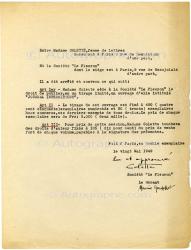 COLETTE (Sidonie Gabrielle Colette, dite)Pièce signée. Paris, 7 décembre 1945 ; 2 pages 1/2 in-4°. Contrat signé entre Colette et Le Fleuron . « Mme Colette confère à la société Le Fleuron qui l’accepte et ce, dans les termes des lois actuelles et futures tant françaises qu’étrangères et des conventions internationales, le droit exclusif d’imprimer, de publier et de vendre la totalité de sa production actuelle et future dans une édition à tirage limité sous forme d’œuvres complètes ». Rare.