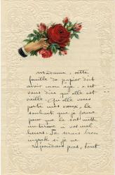 COLETTE (Sidonie Gabrielle Colette, dite)Lettre autographe signée. Sans date ; 1 page 1/2 in-8° sur papier ancien gaufré avec une chromolithographie représentant un bouquet de fleurs.« Madame, cette feuille de papier doit avoir mon âge, c’est vous dire qu’elle est vieille. Qu’elle vous porte mes voeux, le souhait que je forme pour que le sort mette un terme à vos malheurs. Je serais bien ingrate si je ne répondais pas, tout de suite à une lettre aussi simplement belle que l’est la vôtre. Votre exemple m’aidera à supporter avec patience mon mal arthritique de la hanche, d’origine accidentelle, par conséquent inguérissable. Je vous envoie ma bien sympathique pensée, Madame, Colette. »