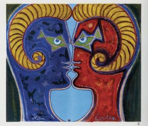 COCTEAU JeanLithographie représentant deux profils face à face. Lil est représenté à travers une forme de poisson, bleu et vert. Chaque personnage est représenté avec une chevelure évoquant une corne de bélier. Un profil bleu, lautre rouge. Il pourrait sagir dune représentation du visage de Jean Marais. Sans date [circa 1960] ; 58,5 x 49 cm (pour la partie imprimée). Non numérotée, cachet de latelier en bas à droite. Pièce superbe à toutes marges.