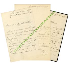 CLAYS Pierre Jean3 lettres autographes signées :— Bruxelles, 4 janvier 1876 ; 2 pages in-12. Adressée à Auguste Willems : lettre concernant des artistes peintres morts, Van Eycken et Van Ysendick.— Bruxelles, 15 février 1876 ; 1 page in-12. Adressée à M. Jamar : « Je viens de terminer les tableaux que je destine à l’exposition de Paris, et je me permets de vous prier de vouloir me faire l’honneur de venir les voir dans mon atelier rue Seutin 27 du 16 courant au 17 inclus. »— Bruxelles, 25 mars 1876 ; 2 pages in-12. Adressée à Auguste Willems : « Je suis convenu avec François sur le choix de deux tableaux pour l’exposition annuelle de Paris. »