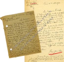 CLOT René-Jean2 lettres autographes signées, adressées à Raymond Nacenta, directeur de la galerie Charpentier :— Paris, le 1er octobre 1945 ; 1 page in-8°. « L’Information a pu monter dans le cycle de leurs expositions L’Empire et la guerre l’exposition de mes œuvres du Tchad. Vous me feriez plaisir en venant les voir, je garde un souvenir très cordial de votre accueil à mon arrivée à Paris. Je suis enfin démobilisé. […] J’ai trouvé par hasard une morsure très intéressante du cuivre, vous verrez, mes eaux-fortes ont beaucoup d’allure. »— Paris, le 29 mai [1948] ; 1 page in-8°, adresse au dos. « Les caisses du Tchad sont arrivées hier à Paris. Comme suite à notre entretien, je vais diriger les tableaux vers la galerie, cela bien entendu ne préjugeant en rien de votre décision. Ce sont, je crois, les seuls documents de guerre se rattachant à des contrées désertiques et, pour ma part, j’ai essayé de les voir, sans trop de souci documentaire, mais comme des paysages prédestinés. Vous savez, cher monsieur, que si l’art est consacré à Paris, le meilleur nous vient souvent de la province dont la leçon est plus pure. »
