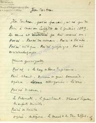 COCTEAU JeanManuscrit autographe, intitulé « Jean Cocteau ». Circa 1946 ; 3 pages in-4°. Très important manuscrit autobiographique écrit à la troisième personne vers 1946. Dans ce texte le poète souligne la cohérence profonde de son œuvre et son souci d’échapper ainsi aux critiques qui l’accusent de dispersion. « Jean Cocteau, poète français, est né près de Paris à Maisons Laffitte le 5 juillet 1889. Son oeuvre est ordonnée par lui-même en Poésie. Poésie de roman. Poésie de théâtre. Poésie critique. Poésie graphique. Poésie de cinématographe. Oeuvres principales. Poésie : Le Cap de Bonne Espérance. Plain Chant. Discours du Grand Sommeil. Opéra. Allégories. Léone. Poésie de roman : Le Potomak. Le Grand Écart. Thomas l’Imposteur. Les Enfants Terribles. Poésie de Théâtre : Orphée. Antigone. Les Mariés de la Tour Eiffel. La Machine infernale. Les Chevaliers de la Table Ronde. Les Parents Terribles. La Voix Humaine. Renaud et Armide. Poésie critique : Le Secret Professionnel. Le Coq et l’Arlequin. Carte Blanche. Le Rappel à l’Ordre. Essai de Critique Indirecte. Portraits-Souvenirs. Poésie graphique : L’Album de Dessins (Stock). Jean l’Oiseleur. Maison de Santé (Livres illustrés). Orphée. Le Secret Professionnel. Thomas l’Imposteur. Le Grand Écart. Dessins pour les Enfants Terribles. Dessins pour les Chevaliers de la table ronde. Poésie de cinématographe : le Sang du poète. L’Éternel retour. A cette liste s’ajoutent les innombrables articles de journaux et de revues qui regrouperont dans les Œuvres complètes entreprise à Genève. Le Coq et l’Arlequin (1924) fut le manifeste de la jeune musique, dite alors “Groupe des Six”. Il collabore en 1917 avec Picasso et Erik Satie pour le ballet Parade. Plusieurs années après, avec Stravinsky pour son oratorio Oedipe Rex. Les entreprises de Jean Cocteau sont multiples mais toujours reliées ensemble par une ligne droite dont on retrouve la trace profonde à travers toutes ses oeuvres. Son prochain ouvrage sera une pièce de théâtre dont il cherche le titre, un drame en trois actes qui s’inspire du style de vie de l’impératrice Elisabeth d’Autriche [L’Aigle à deux têtes]. De scandales en scandales, de succès en succès, nous en arrivons à l’aventure actuelle des « Parents Terribles » qui connaissent enfin le triomphe en 1946 après les foudres du Conseil Municipal avant la guerre et pendant l’occupation le déchaînement de haine de la milice et l’interdiction allemande. »