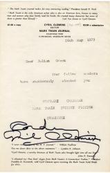 CLEMENS CyrilLettre signée, adressée à Julien Green. 26 mai 1979 ; 1 page in-8°. En-tête imprimé « Mark Twain Journal ».Il lui annonce quà lunanimité des membres, il est élu à la présidence du comité de fiction de la Société Mark Twain.