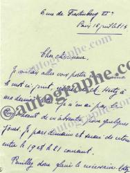 CLAIR RenéCarte autographe signée adressée à Mr Marcel Schneider. Neuilly s/Seine, 21 novembre 1978 ; 1 page in-8° avec enveloppe timbrée. Carte de remerciements pour son anniversaire.