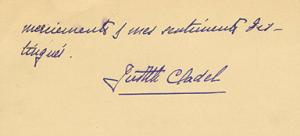 CLADEL JudithCarte autographe signée. 23 décembre 1940 ; 1 page 1/2 in-12 oblongue. « Je vous restitue l'intéressant ouvrage de G. Le Cardonnel et Vellay La littérature contemporaine] que vous avez eu l'obligeance de me prêter. Qu'ils sont vivants, ces entretiens d'écrivains au temps où le monde n'était pas un enfer ! »