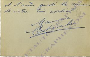 CHEVALIER MauriceCarte autographe signée, adressée à Pierre Veber. 2 pages in-12 oblongues. « Merci de me faire savoir que mon émission ne vous a pas raté. Merci aussi de l’anecdote et d’avoir gardé le souvenir de votre très cordial Maurice Chevalier. »