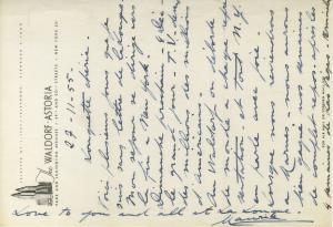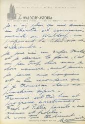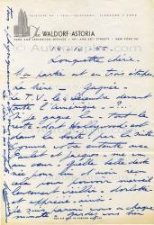 CHEVALIER MauriceLettre autographe signée adressée à Odette Bontemps dite “ Louquette ”. New-York, 27 novembre 1955 ; 1 page in-4° sur papier à en-tête de l’hotel Waldorf-Astoria. Son séjour au Etats unis remplit de succès se termine bientôt et il a hâte de revenir à “ Marnes ” chez lui. « Mon séjour se dirige vers la fin à New-York. Dimanche prochain, 4 déc, le grand jour, TV, devant des millions d’Américains. Au Waldorf on déborde de monde à chaque représentation et tout N.Y en parle avec joie. Lorsque nous reviendrons à Marnes, Nous aurons bien gagné nos semaines de complet repos, après les 4 semaines de Las Vegas. Love to you all at la Louque. »