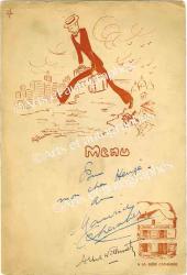 CHEVALIER MauriceMenu signé. 12 mars 1956 ; 4 pages in-folio (30,8 x 21 cm), légères taches et salissures. Menu illustré d’un dessin imprimé de R. Guerini, La Maison Catherine, à Montmartre.Il s’agit du menu du « Dîner Maurice Chevalier du 12 mars 1956 » (imprimé) du restaurant « À la Mère Catherine ».Dédicacé : « Pour mon Cher Heuzé ami, Maurice Chevalier », contresigné par Albert Willemetz.