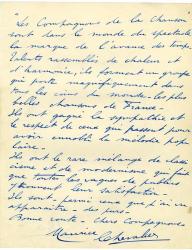 CHEVALIER MauricePièce autographe signée. [1960] ; 1 page in-4°. Reproduite pleine page dans le programme (joint) des Compagnons de la Chanson pour la saison 1960-1961 (8 pages, 31 x 23 cm, plus la couverture).« Les Compagnons de la Chanson sont dans le monde du spectacle la marque de l’avance des temps.- talents rassemblés de chaleur et d’harmonie, ils forment un groupe qui porte magnifiquement dans tous les coins du monde les plus belles chansons de France. Ils ont gagné la sympathie et le respect de ceux qui passent pour avoir ennobli la mélodie populaire. Ils ont le rare mélange de classicisme et de modernisme qui fait que toutes les vagues de publics y trouvent leur satisfaction. Ils sont - parmi ceux que j’ai vu apparaître - des purs.Bonne route chers Compagnons. Maurice Chevalier. »